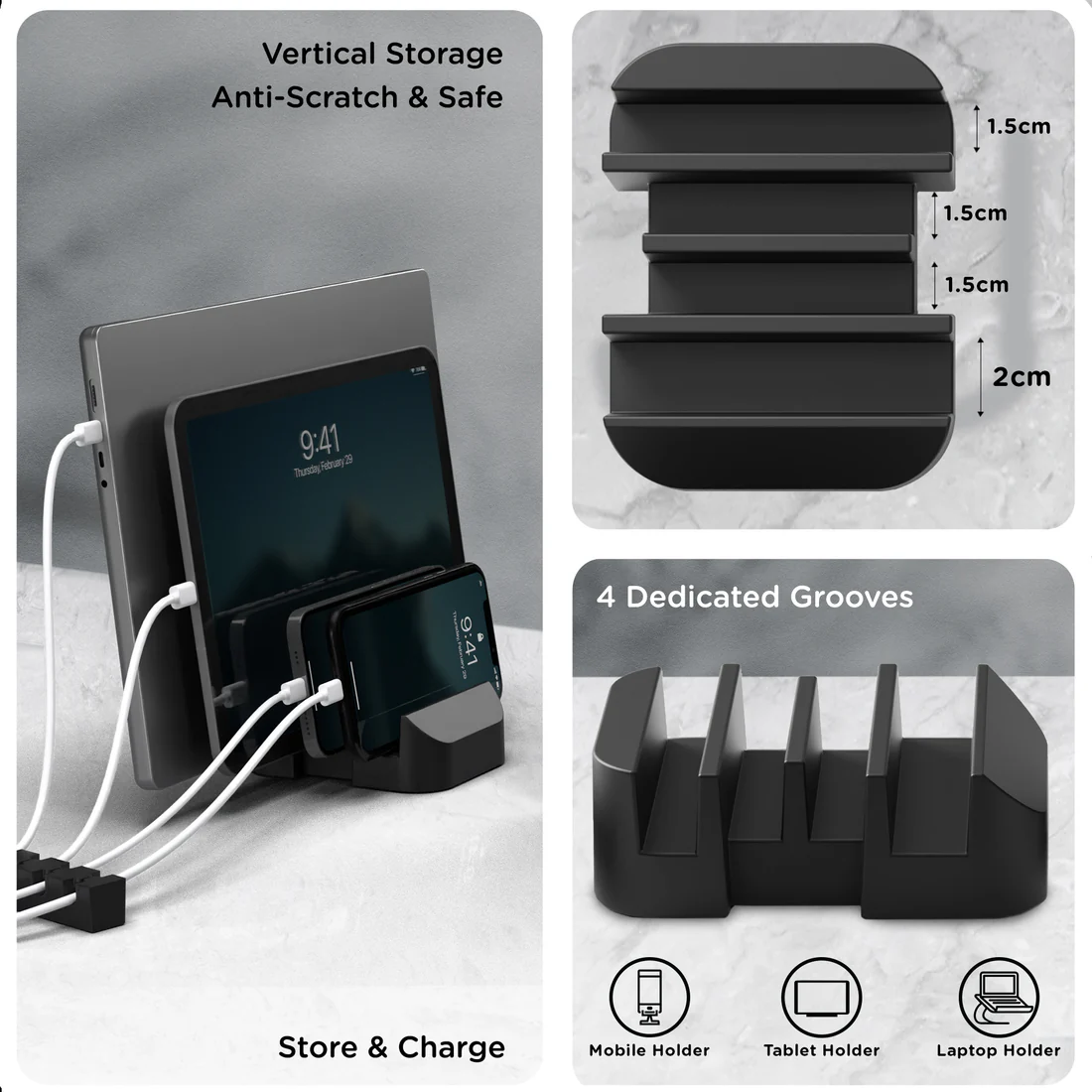 The vertical laptop holder of Modular is designed to accommodate most of the modern laptops, including MacBooks air and pro! It features four grooves, allowing you to dock a combination of laptops, tablets, and smartphones.